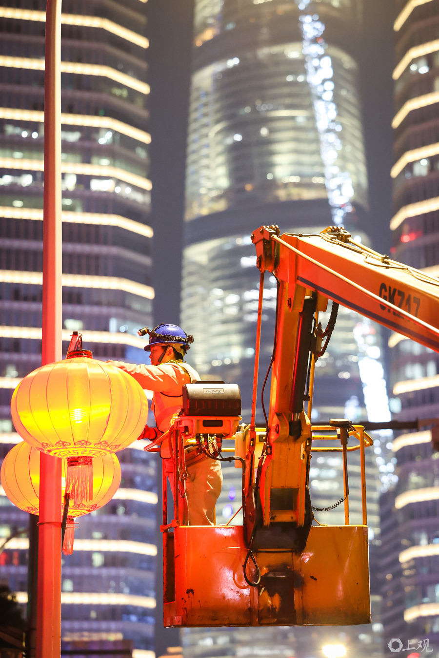 1月20日,新春将至,浦东陆家嘴环岛、世纪大道沿线等张灯结彩,年味浓浓,工作人员对路边悬挂的红灯笼进行最后检查。