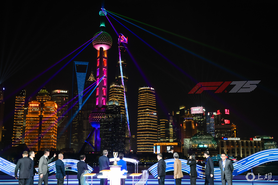 3月20日,2025 FORMULA 1 喜力中国大奖赛启动仪式在位于北外滩的世界会客厅举行,黄浦江对岸的陆家嘴建筑群上演灯光秀,无人机表演展示F1中国大奖赛赛事元素。