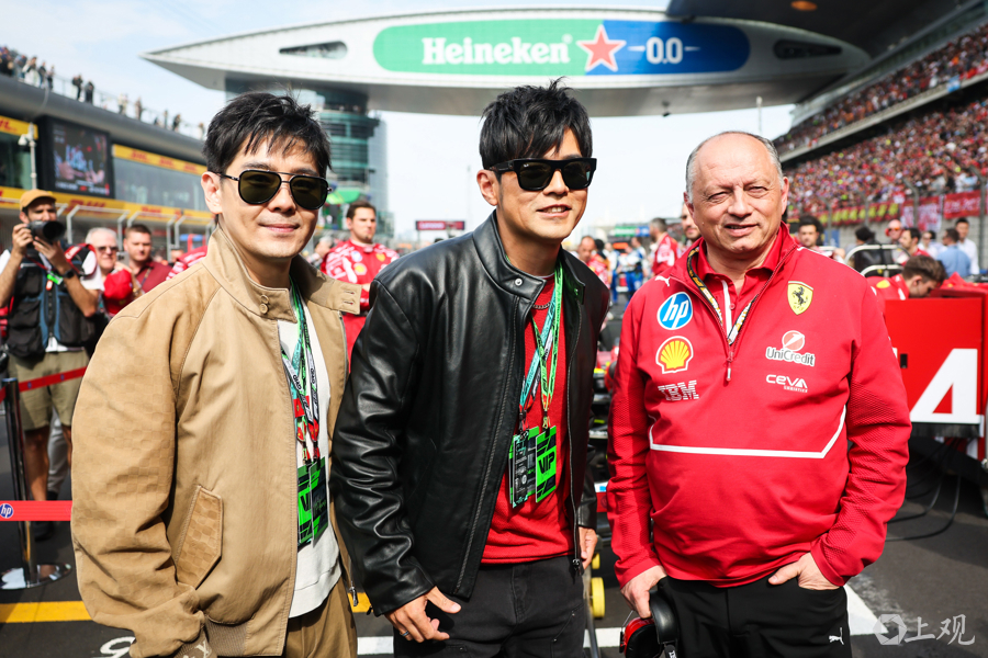 3月23日,歌手周杰伦进入F1中国大奖赛赛道观摩赛场、合影留念。