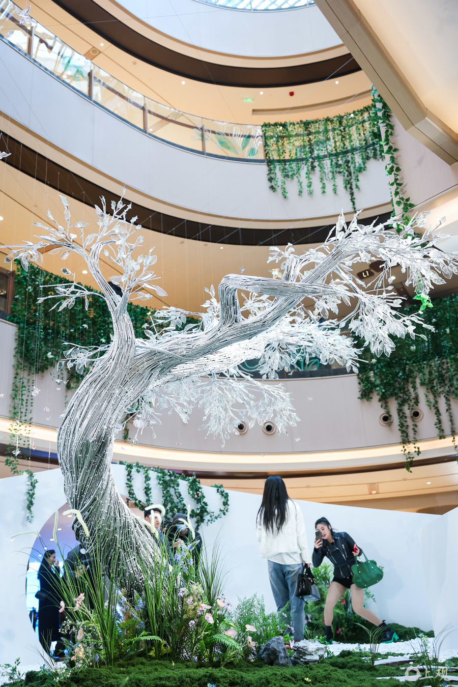 4月1日,以可持续为理念的公共艺术项目“焕然Reborn”在兴业太古汇呈现“魔法森林”。艺术家融合非遗花丝盘丝工艺与再生艺术,用废旧钢筋、废弃玻璃瓶、废旧牛仔布等材料制成树状雕塑和“机械鹿”,为观众带来沉浸式体验。