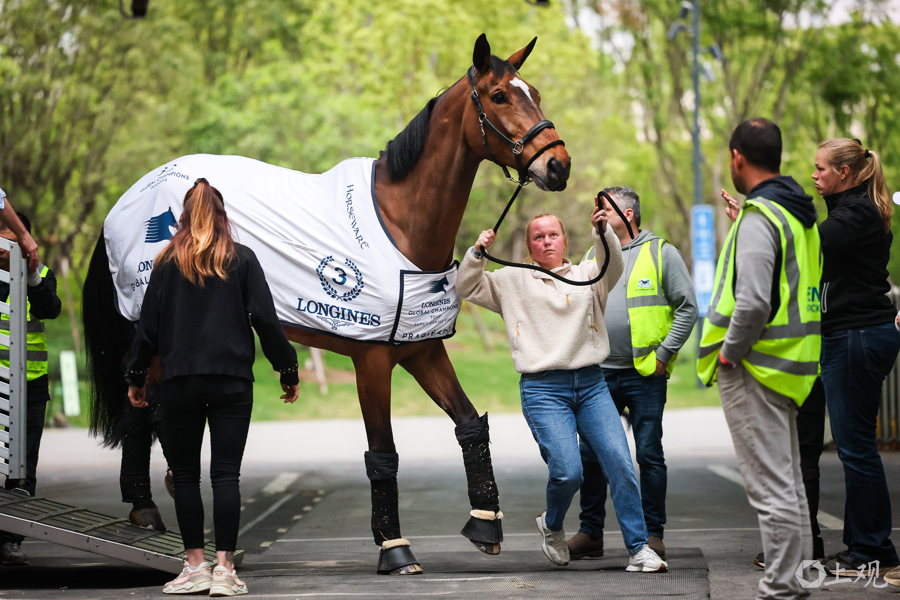 4月27日,2025上海浪琴环球马术冠军赛首批50匹顶级赛马在专业团队和量身定制的马车运送下,顺利运抵久事国际马术中心,赛事筹备工作进入冲刺阶段。