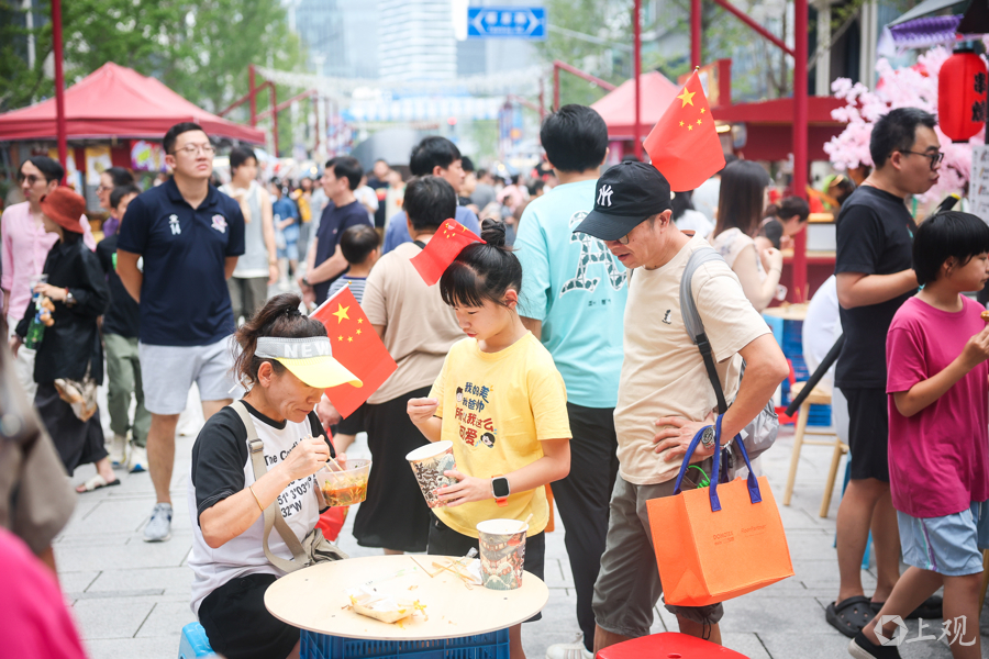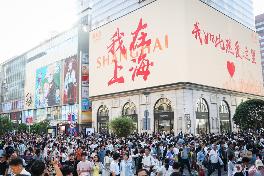5月2日,南京路步行街“五一”假期人潮涌动、热闹非凡,尽显都市活力与繁华。
