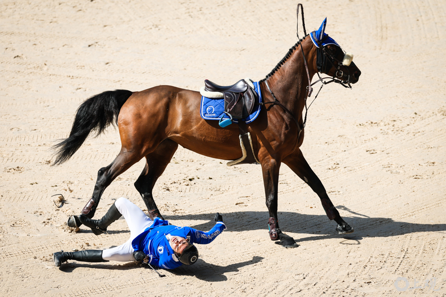 5月3日,2025上海浪琴环球马术冠军赛在久事国际马术中心举行,参赛选手在比赛中意外落马。