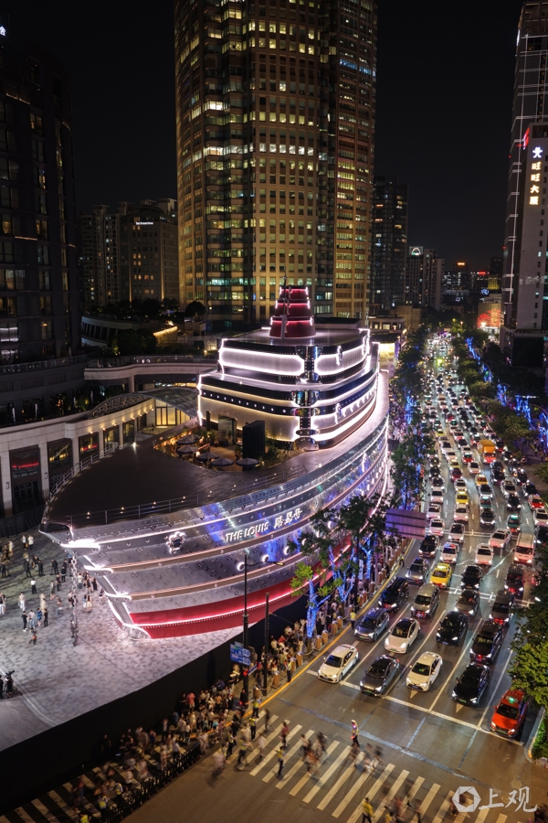 6月26日,航拍南京西路商圈的路易威登“巨轮”——“路易号”与灯光交相辉映。