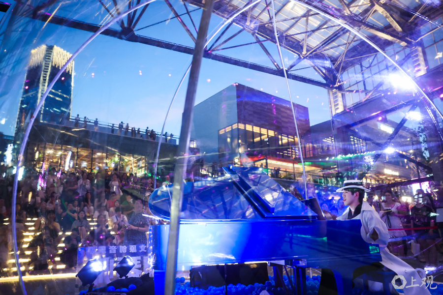 7月4日,徐汇滨江西岸梦中心“海洋泡泡”装置引关注,蓝色钢琴配海洋球,每晚7点举行的现场演奏,观众赏乐纳凉,惬意满满。