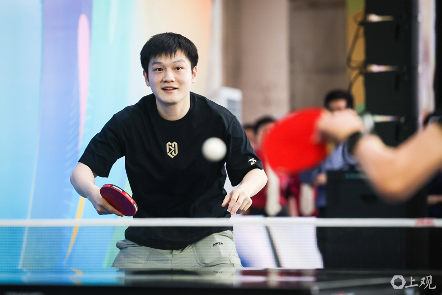 7月18日,巴黎奥运会乒乓球男单冠军樊振东来到杨浦区复兴岛船台Park,“做客”上海市“国球三进”系列争霸赛暨“韵动杨浦·秀出来”乒乓球选拔赛,引燃了现场球迷的热情。
