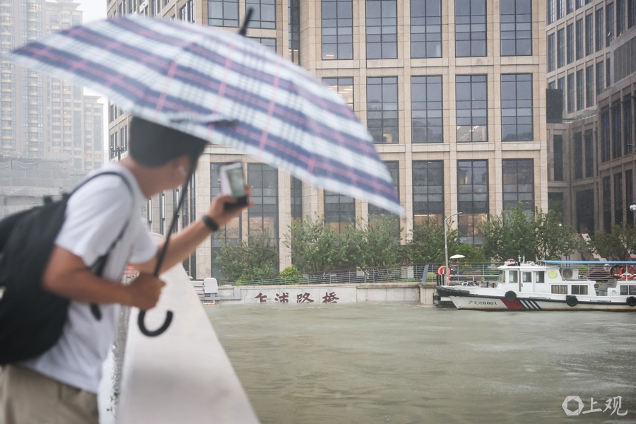 7月30日,台风“竹节草”来袭,给上海带来了大暴雨,苏州河水位上涨,乍浦路桥桥名被淹一半。
