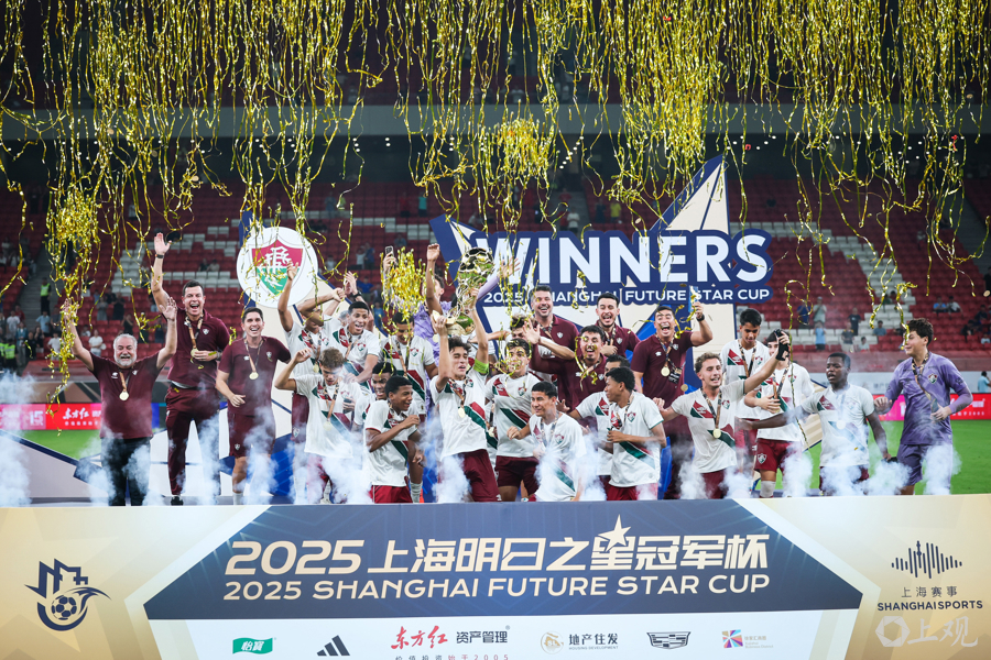 8月3日,上海明日之星冠军杯足球赛在浦东足球场落幕,巴西弗鲁米嫩塞2:0击败葡萄牙本菲卡夺冠,现场万名观众观赛气氛火爆。
