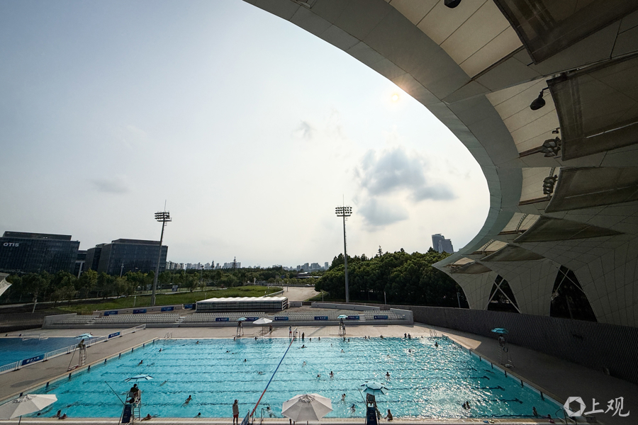 8月5日,上海持续晴热高温,中心城区气温达35℃,体感闷热难耐。众多市民纷纷前往上海东方体育中心"月亮湾"室外泳池消暑纳凉,享受夏日清凉。