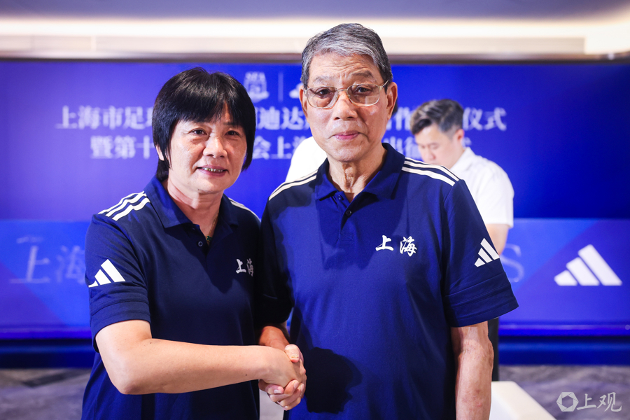 8月8日,上海市足球协会与德国著名运动品牌阿迪达斯战略合作签约仪式暨第十五届全国运动会上海足球队出征仪式,在上海体育场会议中心举行。上海全运女足主教练水庆霞、上海全运男足U20队总教练徐根宝握手合影。