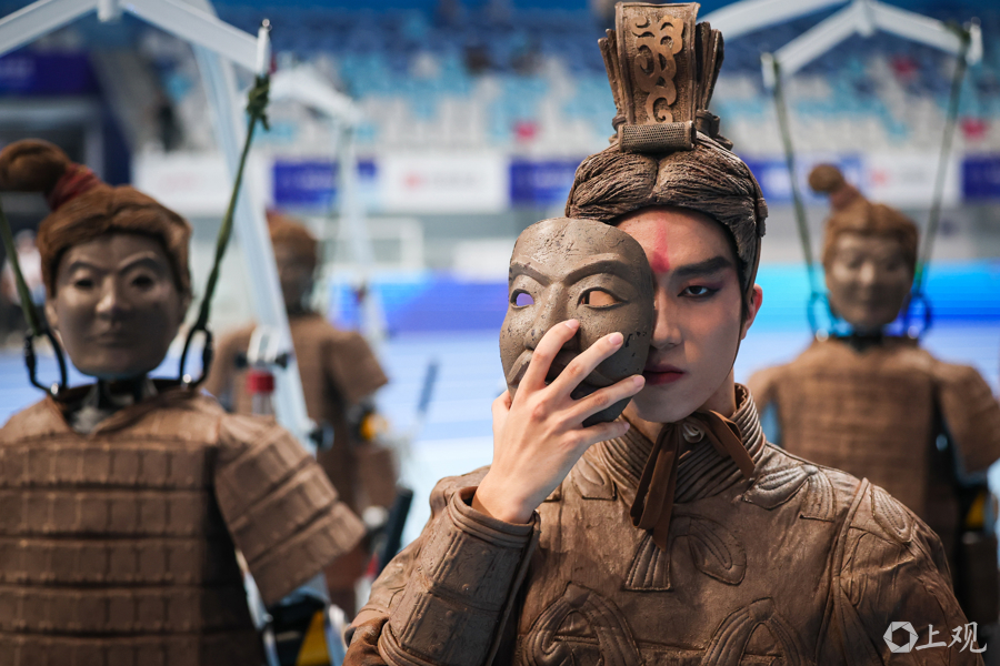 8月14日,“2025世界人形机器人运动会”开幕式前,舞蹈演员在“冰丝带”进行准备工作。