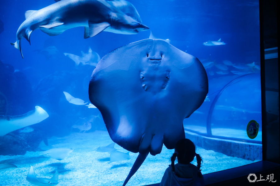 9月23日,长风海洋世界推出“鳐鱼星空”主题展区,86尾7种鳐鱼迁入升级鲨鱼甬道,光影与维生系统打造星河般梦幻水域。