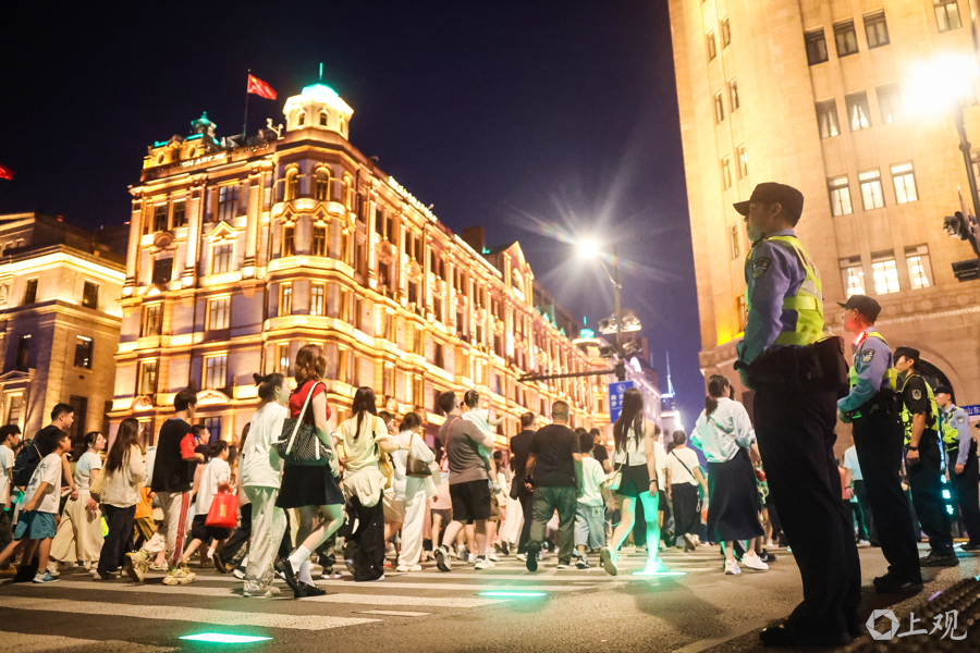 8月8日,晚上十点多的南京路步行街依旧人潮涌动。暑期旅游高峰,黄浦区南京路、淮海路15家餐饮老字号延长夜市营业,满足游客需求并提升收益。