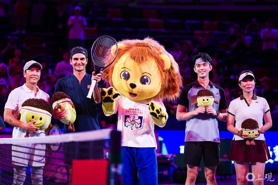 10月10日,退役瑞士网球名宿费德勒在2025年ATP上海网球大师赛的中央场馆亮相,与现场观众共度“超级挚友之夜”活动。费德勒和中国网坛金花郑洁,演员甄子丹、吴磊一起,带来双打秀。