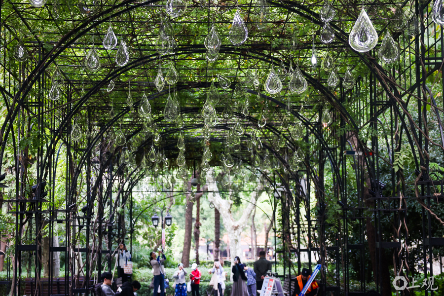 10月23日,复兴公园内的藤蔓花架下,名为《雨》的艺术装置引发市民打卡热潮。该作品通过悬挂600个曼陀罗风铃,在公园藤蔓花架下营造出"雨滴悬停"的诗意景观。