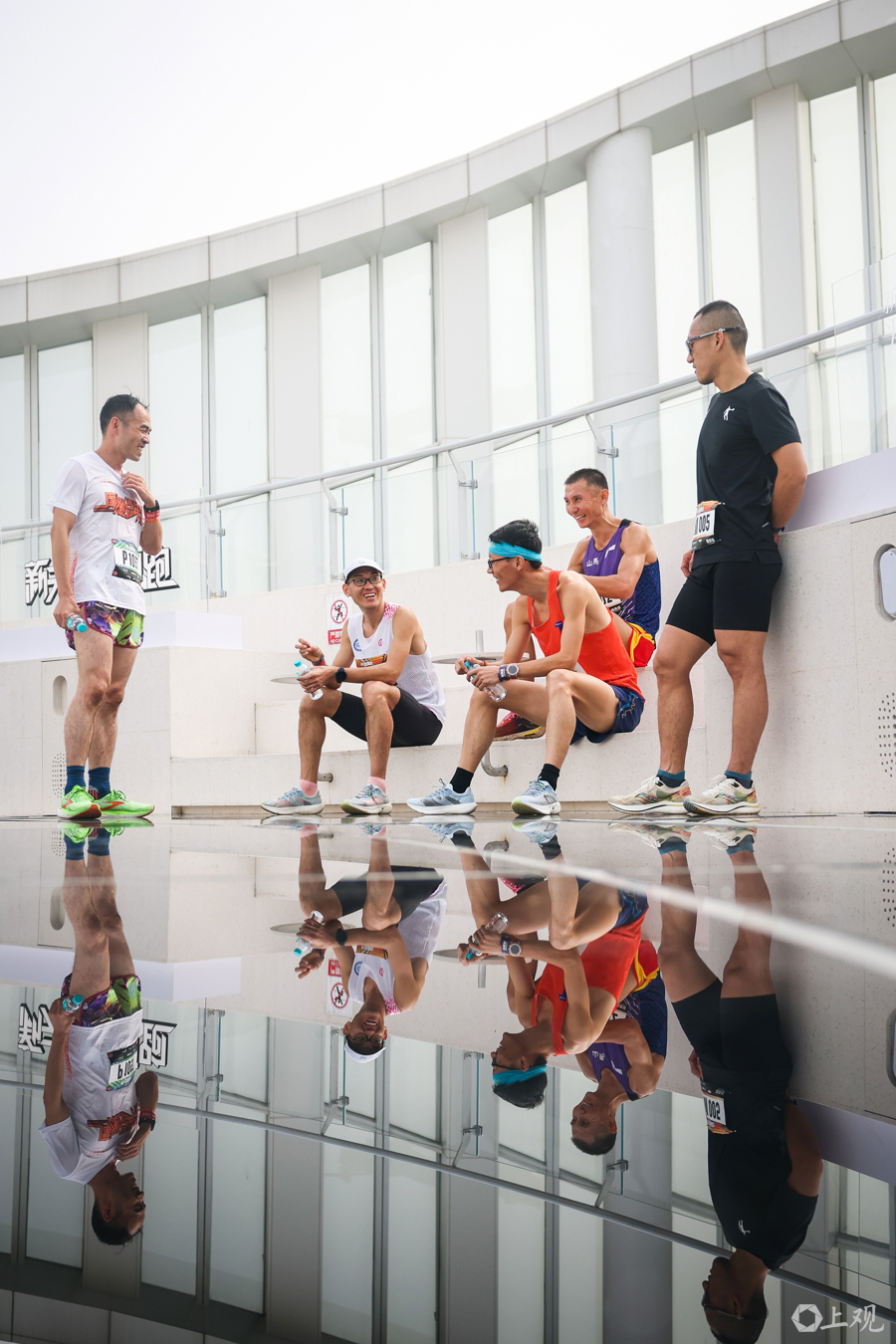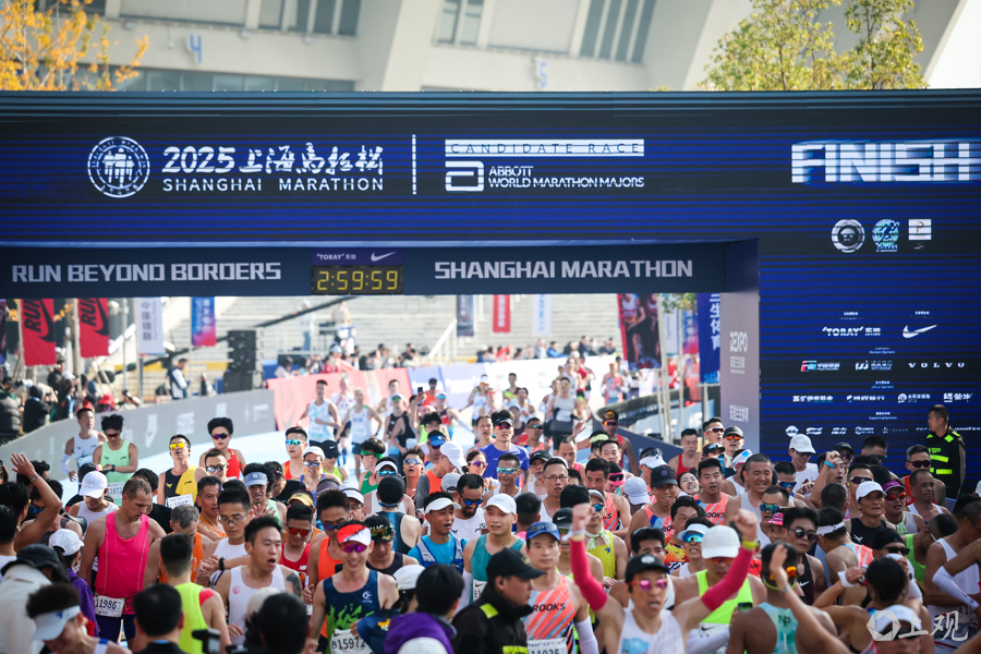 11月30日,2025上海马拉松“破三”选手陆续抵达位于徐家汇体育公园的终点。