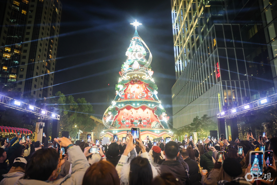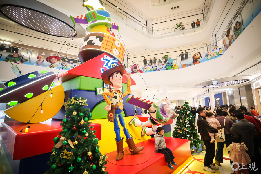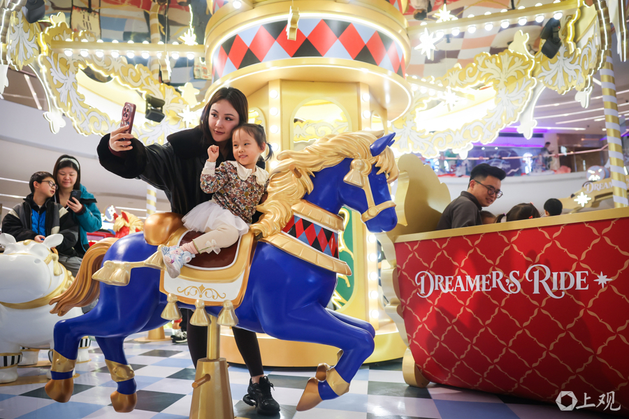 12月27日,人们在上海陆家嘴中心体验“骑境嘉年华”主题美陈,18米双层巨型旋转木马、1500平方米灯饰画绘就童话之境。