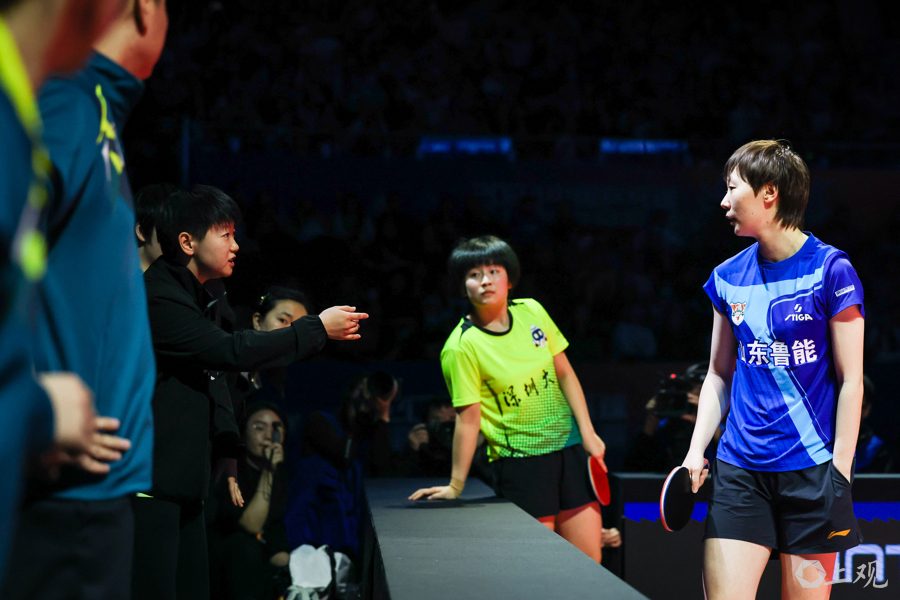 1月1日,2024赛季中国乒乓球俱乐部超级联赛女团决赛在上海体育馆落下帷幕。王曼昱对阵覃予萱的第四局比赛中出现争议球,导致比赛中断,孙颖莎与王曼昱在场边进行交流。\n经过激烈的五盘大战,山东鲁能队以总比分3:2战胜卫冕冠军深圳大学队,夺得冠军。