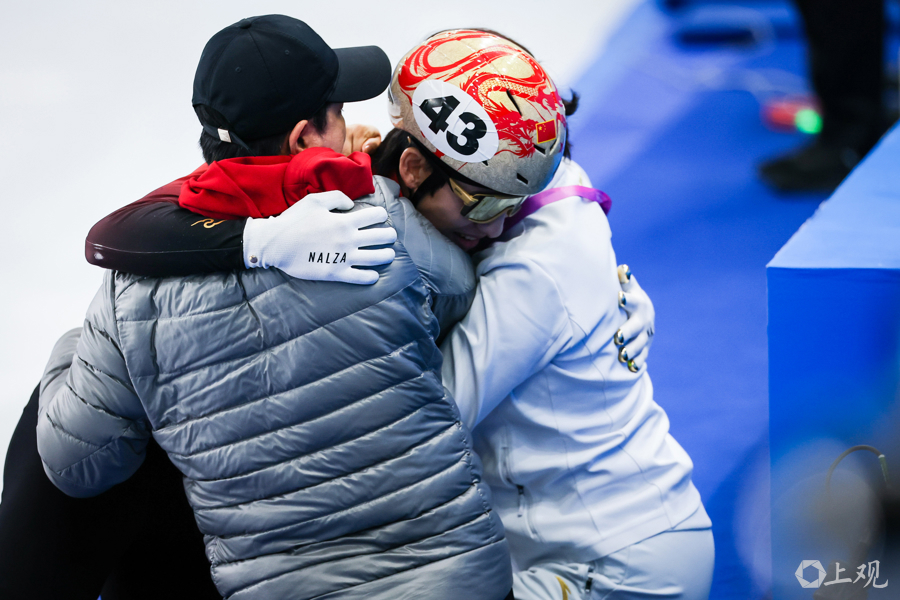 2月8日,哈尔滨亚冬会短道速滑男子500米决赛,中国选手林孝埈夺得金牌,林孝埈在赛后与教练拥抱庆祝夺冠。