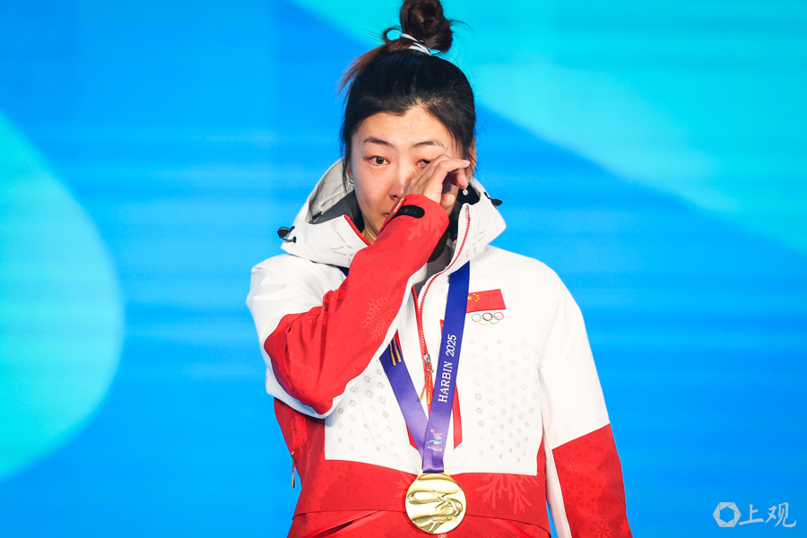 2月9日,中国队选手、北京冬奥会冠军徐梦桃在自由式滑雪女子个人空中技巧决赛中获得金牌,颁奖仪式上的她擦拭眼泪。