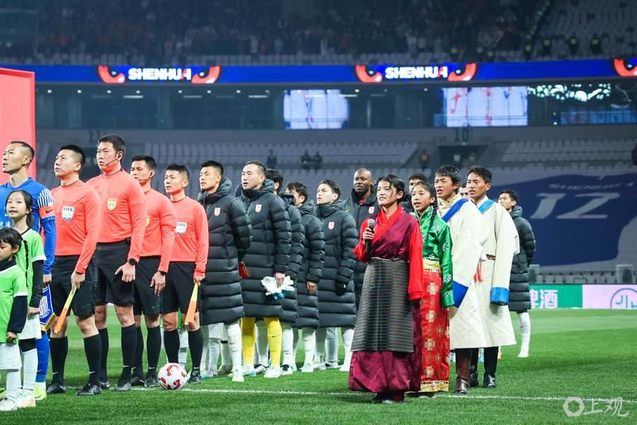 2月22日,2025赛季中超揭幕战上海申花对阵长春亚泰的比赛在上海体育场进行。强巴旦增、旦增班久、阿旺措加、旦增曲美等四位来自地震灾区的定日二中藏族学生,在中超揭幕战前唱响国歌。