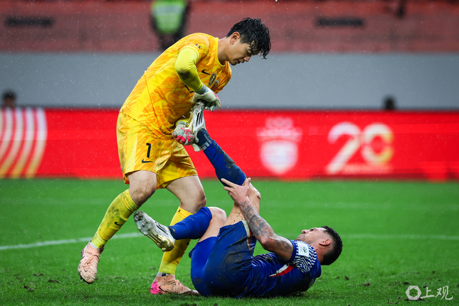 6月22日,足协杯1/8决赛迎来上海德比,上海海港坐镇上汽浦东足球场迎战上海申花,最终上海申花3:2客胜上海海港晋级足协杯八强。比赛中,海港队守门员颜骏凌为抽筋的申花前锋路易斯进行拉伸。