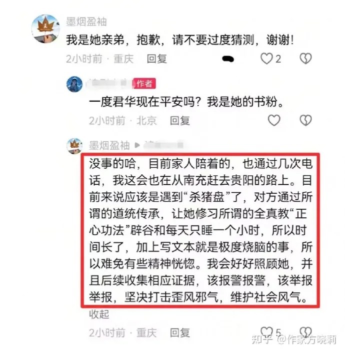 据新浪娱乐,自称是一度君华弟弟的网友报平安,透露姐姐目前家人陪着,应该是遇到“杀猪盘”,后续将收集相应证据报警。