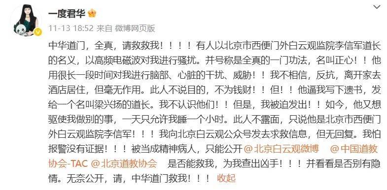 13日,《星落凝成糖》作者@一度君华发文求救,称有人以高频电磁波对她进行骚扰,逼她写下遗书,一天只允许睡一小时。